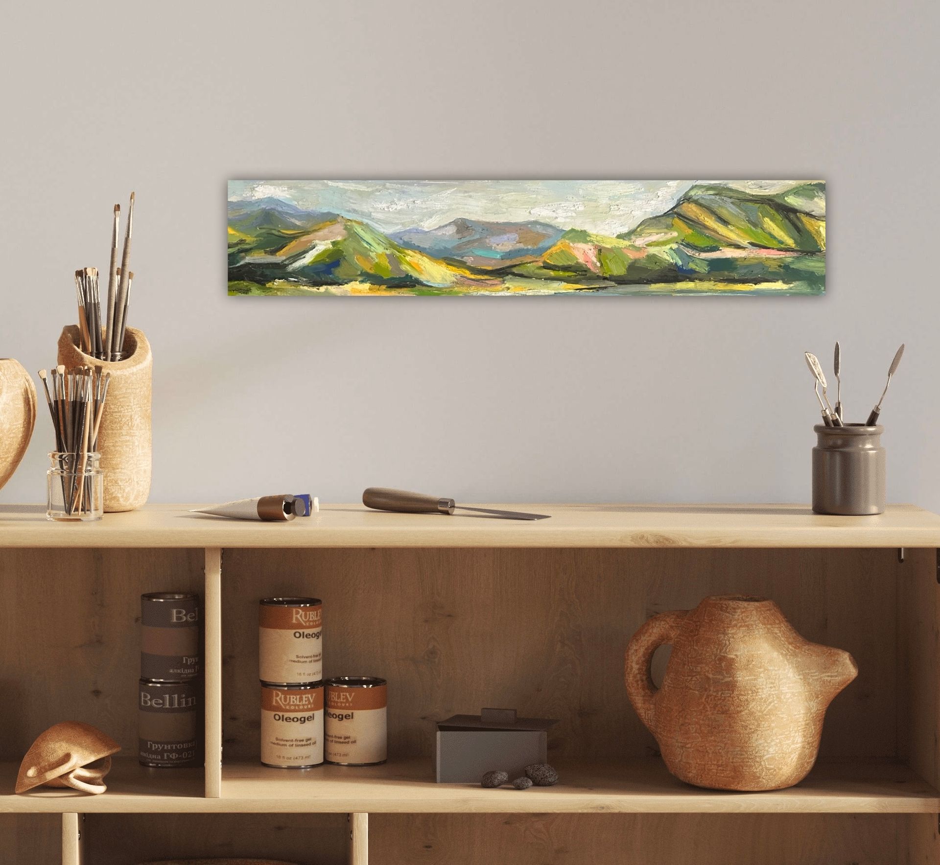 Her preferred mediums are acrylic and oil, with her oil paintings often embracing a sculptural quality through heavy impasto techniques that add depth, movement, and drama. Marcia’s landscapes and seascapes are deeply personal, often drawn from childhood memories of the rugged coastline and mountainous beauty of North Wales. These pieces aim to evoke a strong sense of presence and narrative — a moment held in time.
